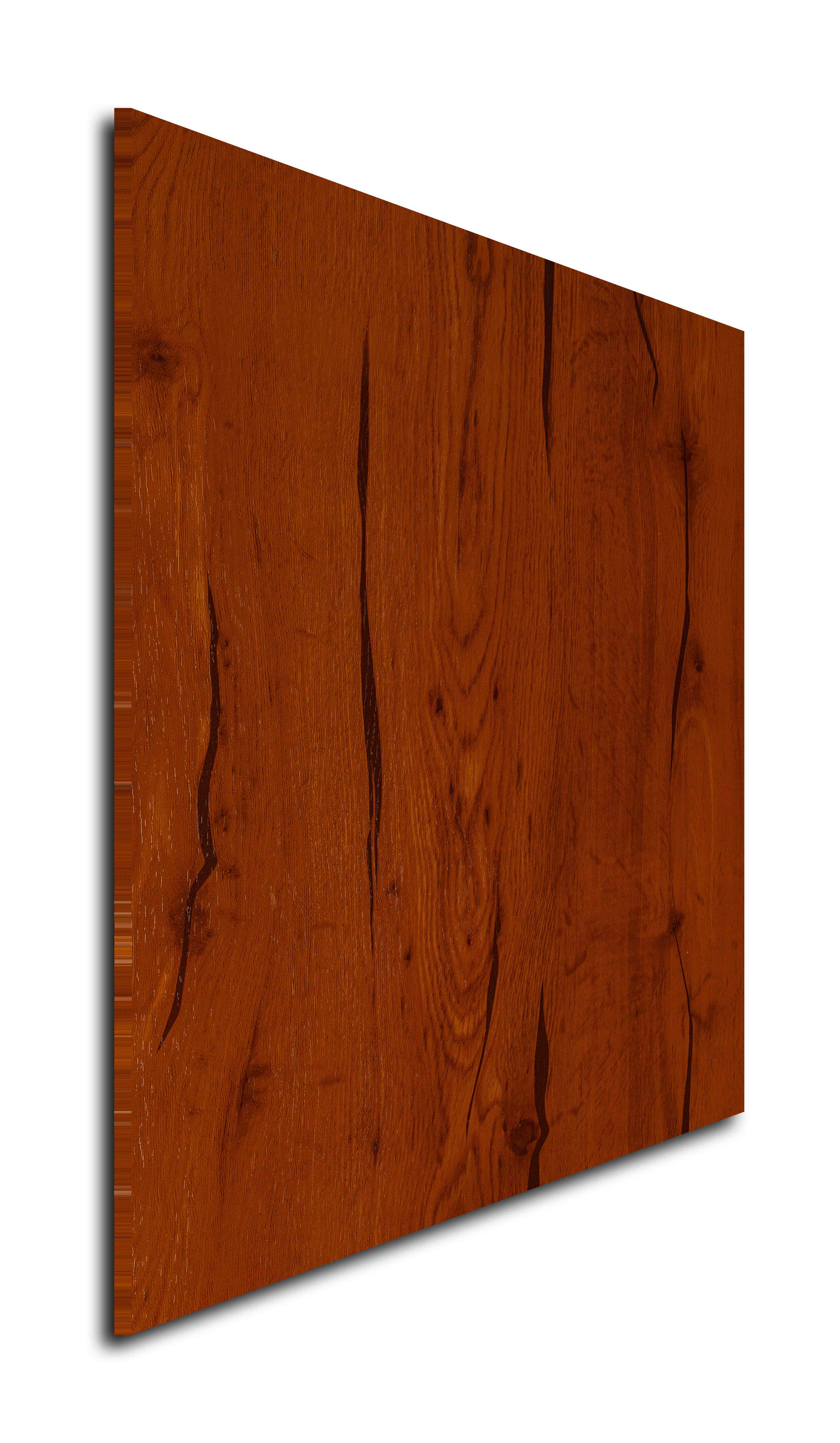 | Description | Deep reddish-brown wood laminate featuring a prominent, cracked, and heavily distressed grain pattern with dark fissures and a rich, warm tone |