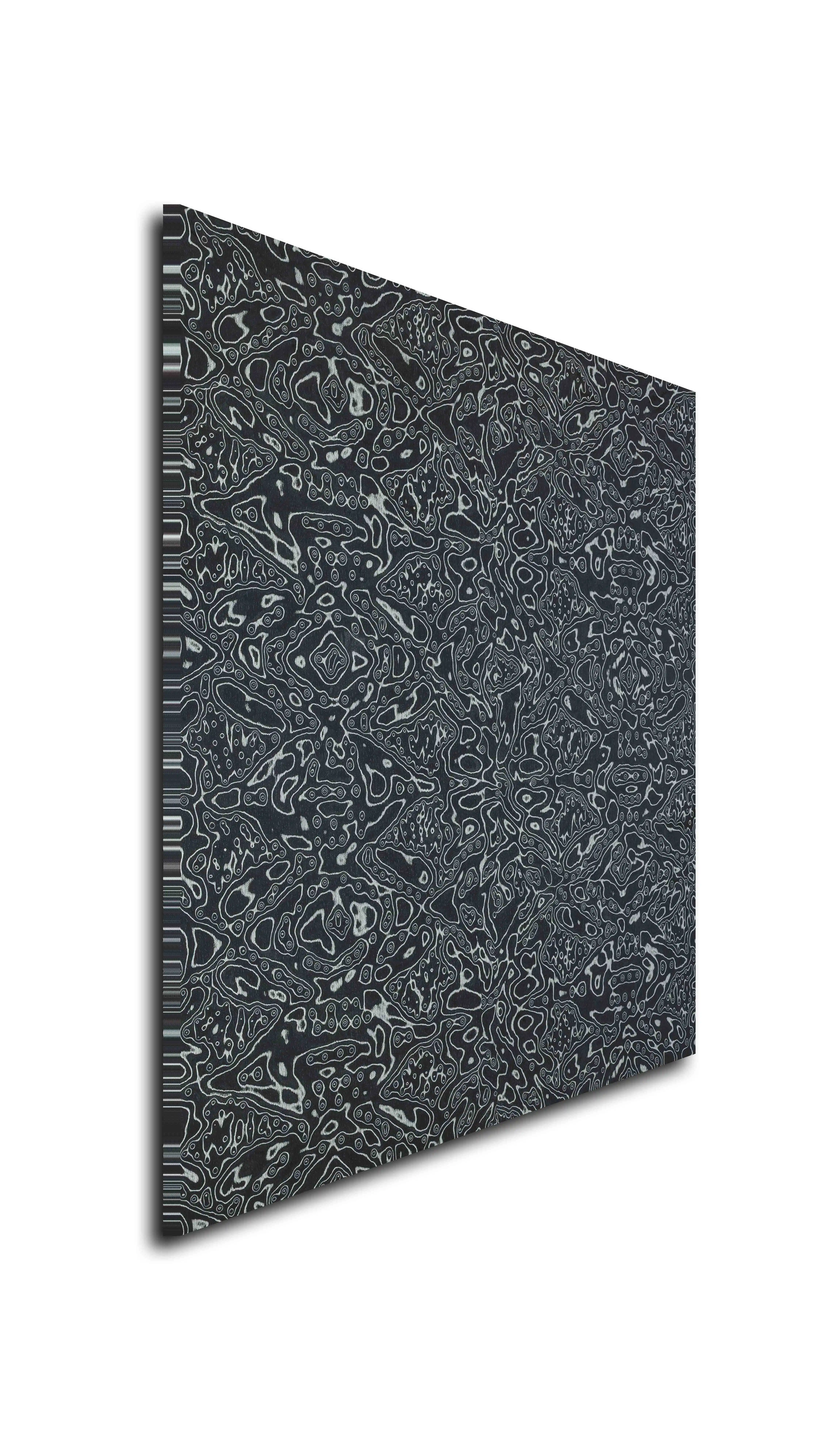 | Description | A high-contrast, intricate pattern resembling etched metal, featuring swirling, interconnected light lines on a dark, matte background |