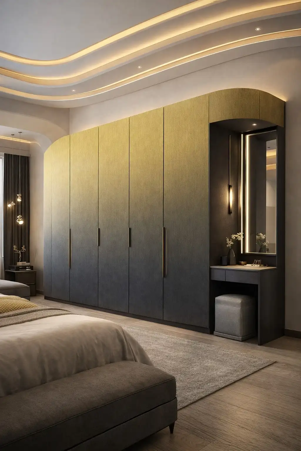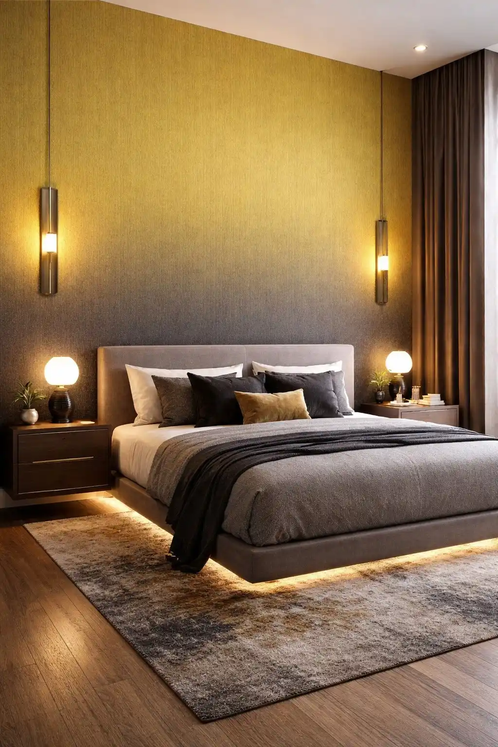 | Texture Feel | A premium architectural surface featuring a seamless vertical gradient transition from a bright, brushed gold luster to a deep, matte charcoal-grey textured finish |