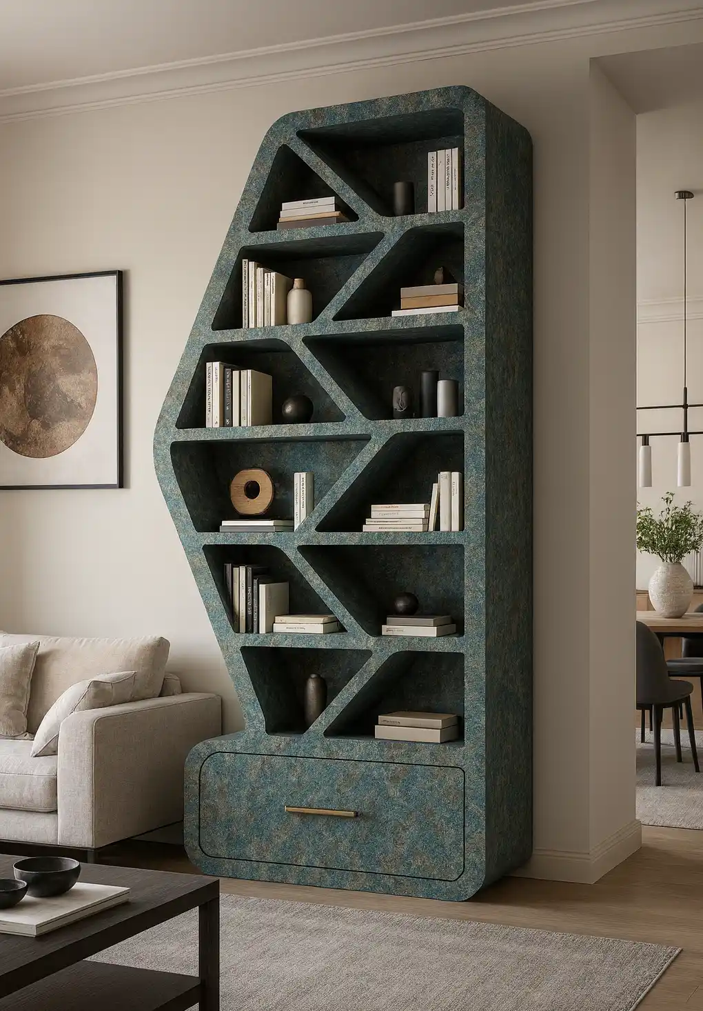 | Color Description | A complex mix of teal, deep ocean blue, charcoal grey, and slate, interspersed with warm accents of rust, bronze, and earthy brown |