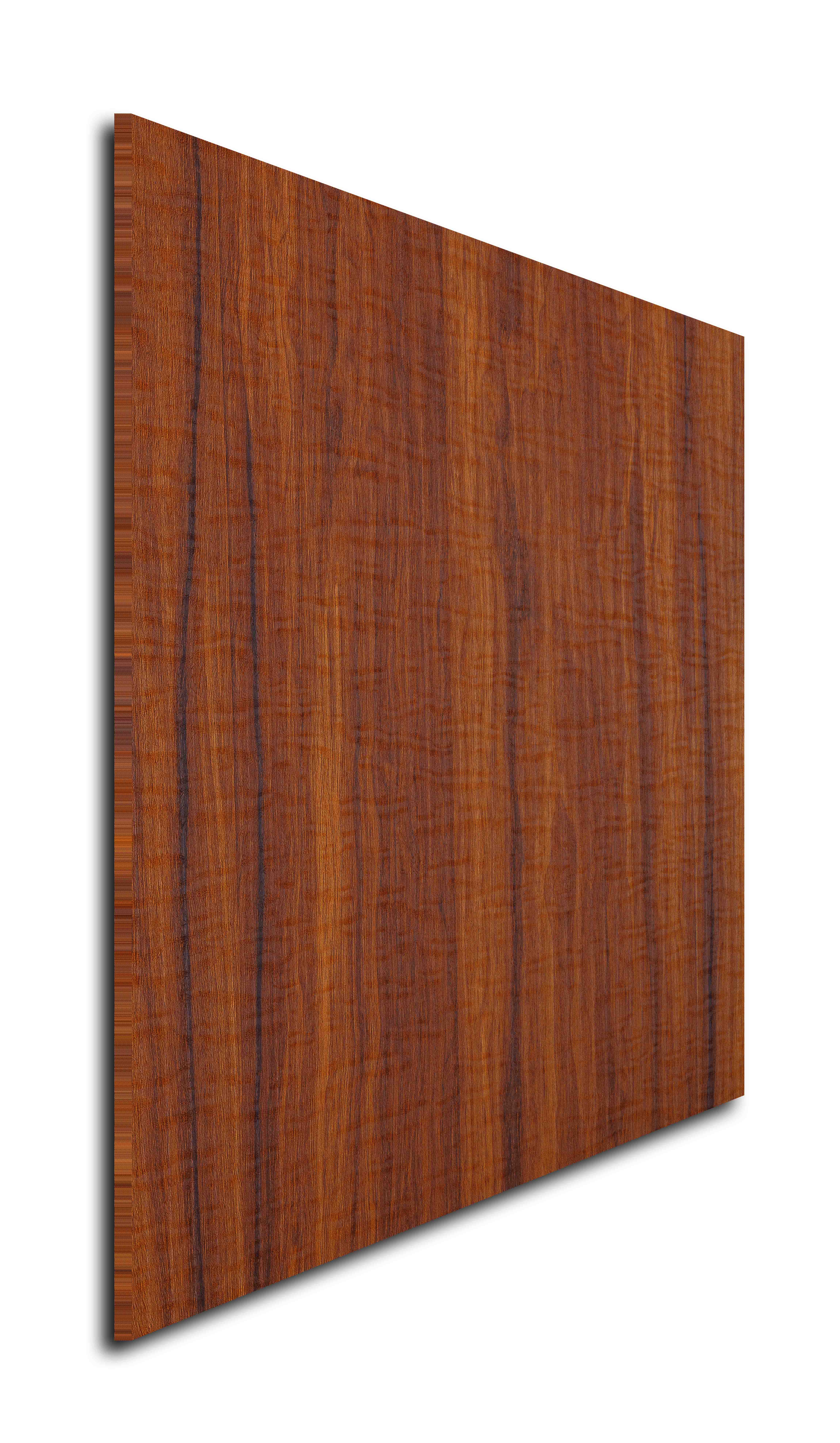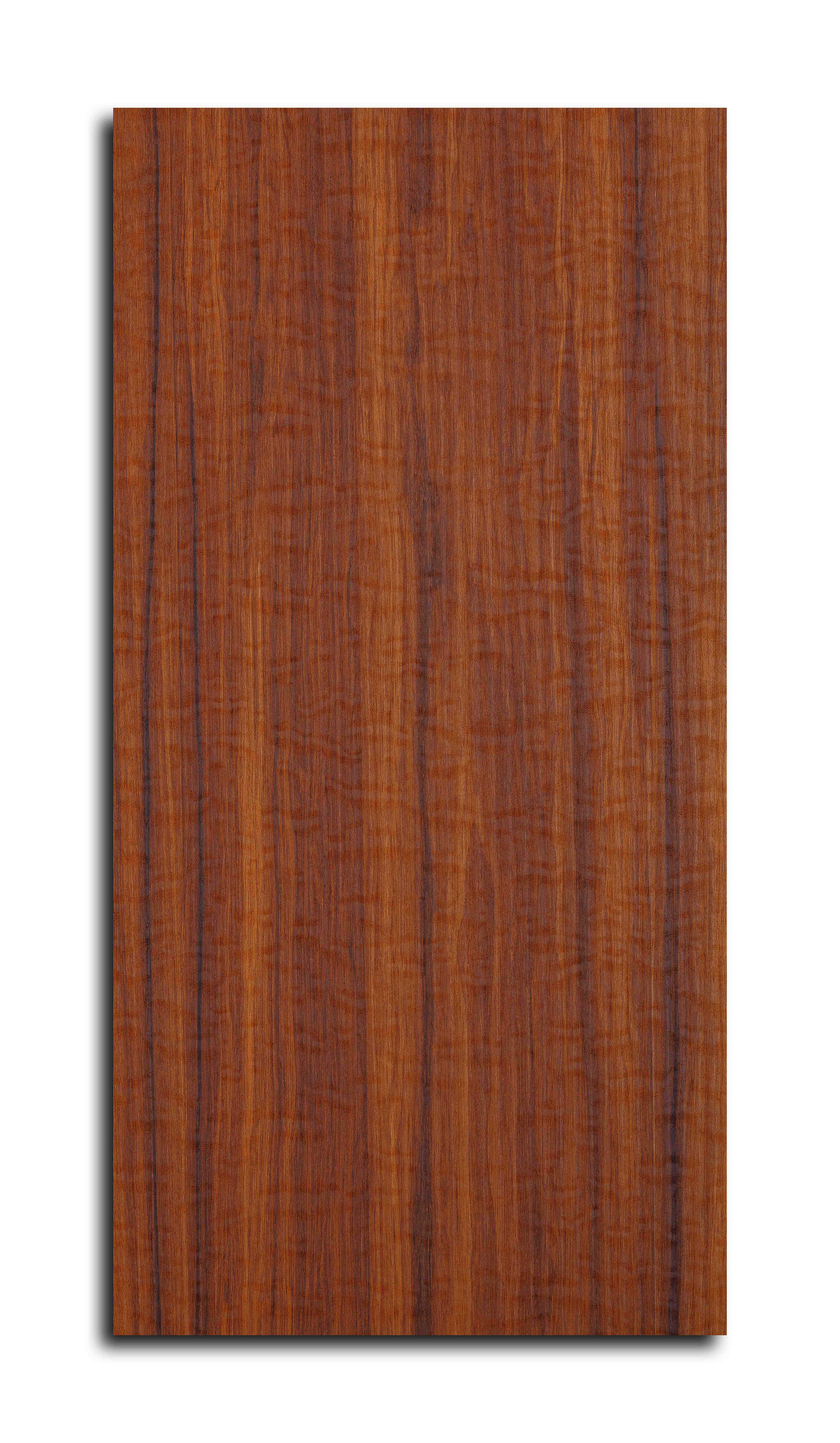| Description | A dark, rich reddish-brown wood grain with pronounced, subtle wavy figuring (chatoyance) throughout, suggesting a quartersawn cut and a high-quality veneer |